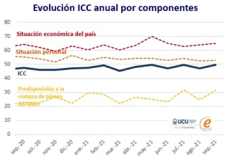 Respecto a setiembre 2020, el índice fue 2,2 puntos mayor; y, si se consideran los promedios acumulados (ene-20/set-20) y (ene21/set-21), el ICC fue 2,1 puntos superior. "Por lo tanto, como viene sucediendo desde marzo de este año, la confianza del consumidor es mayor en 2021 respecto a la misma fecha del año anterior. La mejora registrada en el ICC este mes se corresponde con una mejora en los tres subíndices que lo componen, aunque de distinta magnitud. El subíndice que más aumentó fue la Predisposición a la compra de bienes durables, mientras que la Situación económica personal aumentó apenas marginalmente, manteniendo casi el mismo puntaje de agosto 2021", dice el ICC que elaboran la Cátedra de Confianza Económica de la UCU y Equipos.