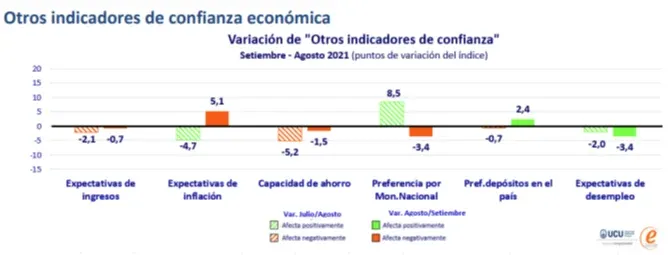 Por último, la Predisposición a la compra de bienes durables aumentó 6,7 puntos, ubicándose con 31,2 puntos, similar a la situación de julio 2021 en los niveles que alcanzaba antes de la pandemia. Los componentes del subíndice aumentaron ambos (electrodomésticos, y automóviles y viviendas), lo que puede ser resultado de una mejora en la percepción económica personal, el apoyo de UTE a la compra de electrodomésticos categoría A, divulgado en setiembre, y la tendencia a la baja del dólar.