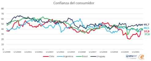 Al analizar la variación del índice, se observa que los países tuvieron desempeños dispares, Uruguay y Argentina se encuentra en el nivel de moderado pesimismo (entre 40 y 50 puntos) y Brasil y Chile permanecen en el nivel de atendible pesimismo (menos de 40 puntos) aunque muy cercanos al nivel de moderado pesimismo.