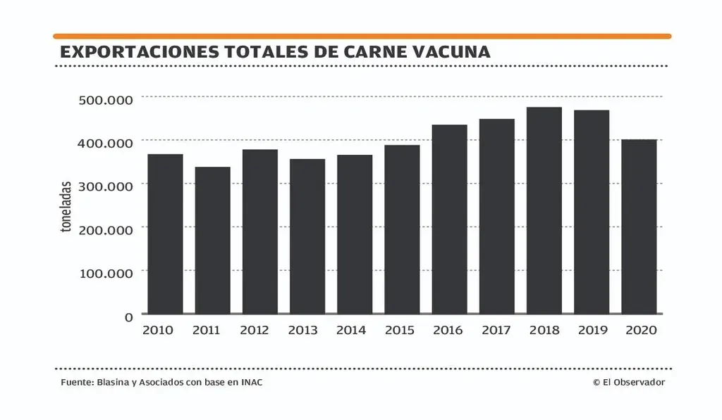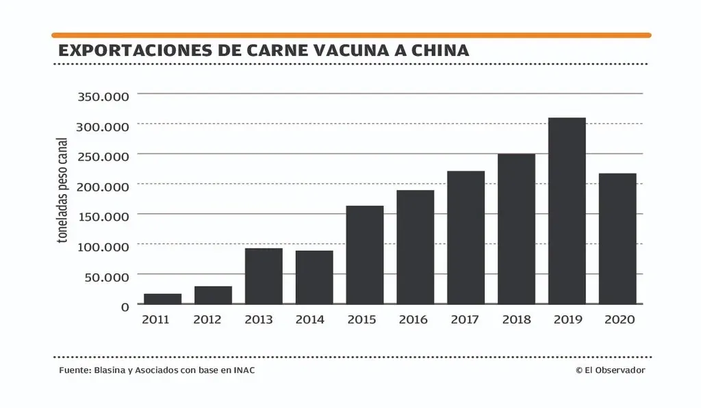 Las ventas a Corea del Sur se triplicaron, pasando de 467 toneladas peso canal en 2019 a 1.200 en 2020, pero se ubicaron muy por debajo de las 3.056 toneladas enviadas en 2018.