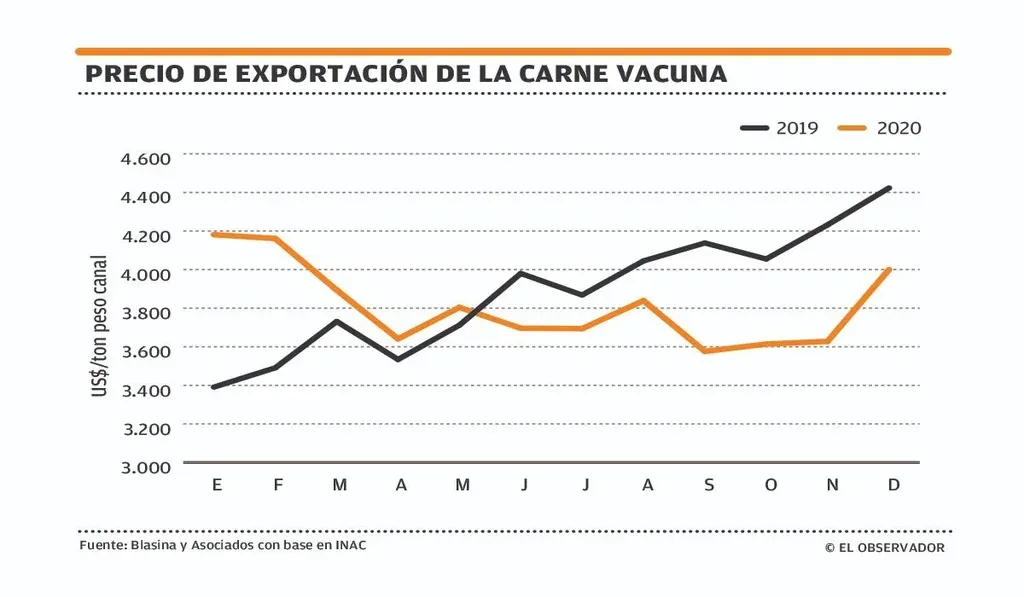 Aun así en noviembre las ventas a China superaron a las del año pasado. Alcanzaron además el mayor volumen mensual desde que hay registros, pero con una fuerte baja en el precio. Totalizaron 30.572 toneladas, un 13% más que las 24.008 de un año atrás. El precio de exportación cayó unos US$ 700 por tonelada respecto a noviembre del 2019: promedió US$ 3.244 por tonelada peso canal, es decir un 20% menos que los US$ 3.951 de un año atrás.