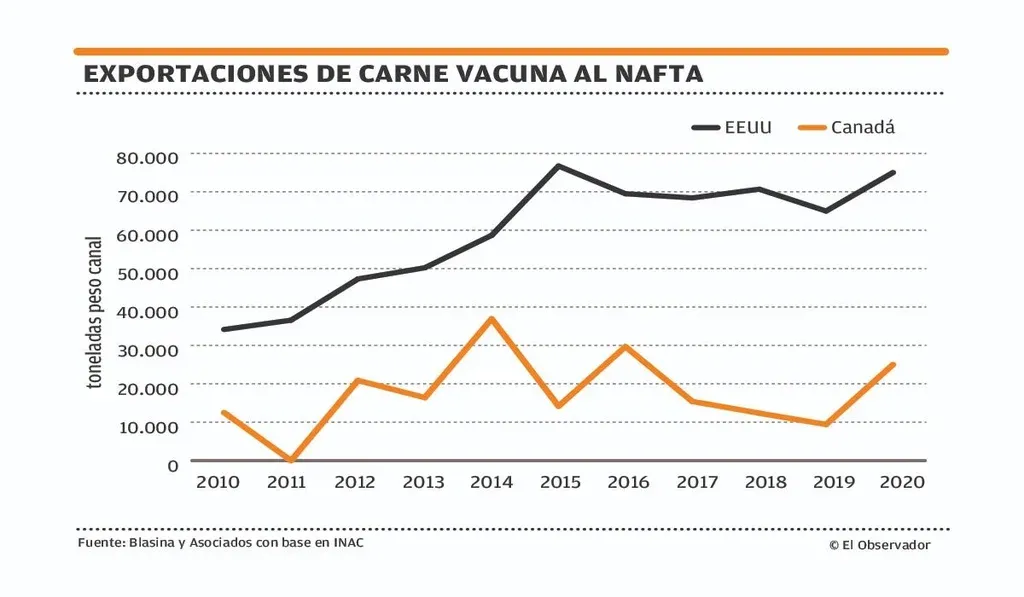 Actualmente Uruguay ingresa a Estados Unidos con una cuota de 20.000 toneladas con un arancel de US$ 44 por tonelada (1% del valor), la cual fue completada dos meses antes de finalizar el año. Incrementar el volumen enviado por fuera de la cuota se ve limitado por las restricciones arancelarias, ya que luego de completado el cupo el arancel pasa a ser de 26,4%.