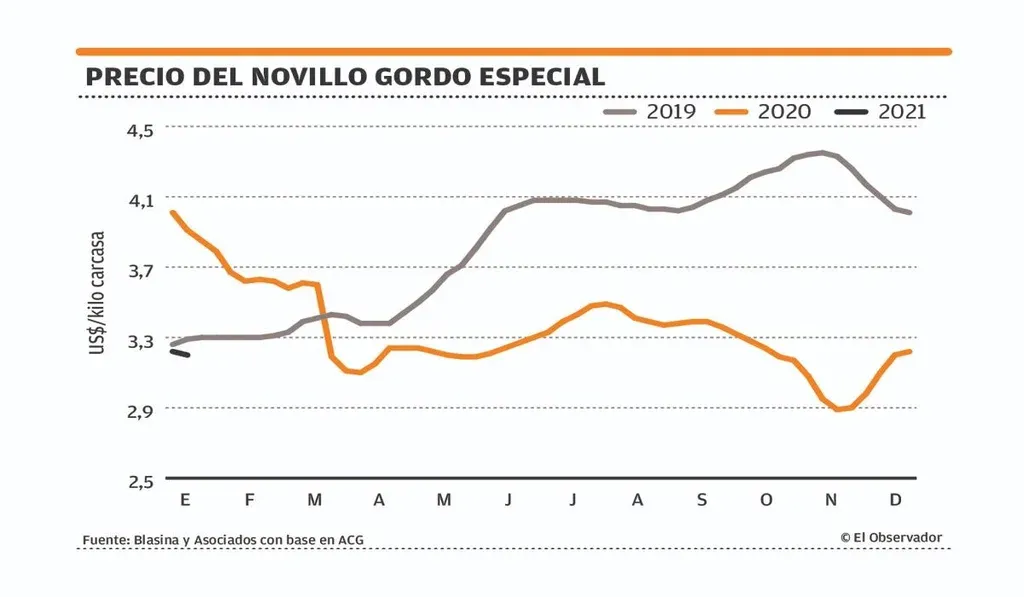 Brasil lo sigue con un novillo de US$ 3,55 al cierre de la jornada del 12 de enero, un incremento de 9 centavos respecto a la cotización del día anterior. Manteniéndose sin cambios en dólares y aumentando 5% en reales respecto a un mes atrás según el índice Esalq publicado por el Centro de Estudios Avanzados en Economía Aplicada (Cepea).