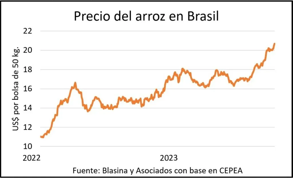 El precio del arroz sigue mostrando firmeza y se acerca en Brasil a los US$ 21 por bolsa, respaldado por la baja de la cotización del dólar en el mercado brasileño en el final de la semana.