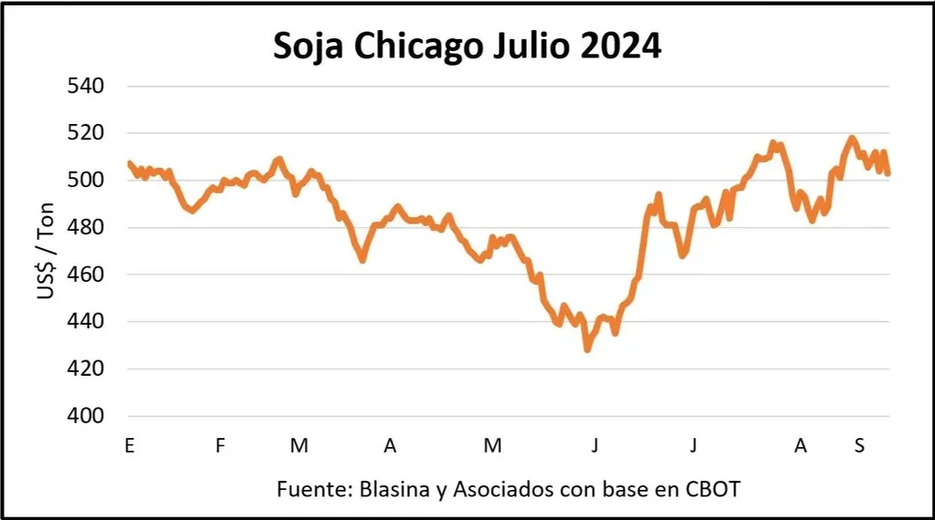 Las compras de soja de China en Brasil y Argentina –que vendió unos 2 millones de toneladas con el régimen actual– contrastaron con la ausencia de operaciones chinas en el mercado estadounidense, presionando las cotizaciones a la baja hasta los US$ 503 para la soja 2024 y US$ 492 la posición noviembre.