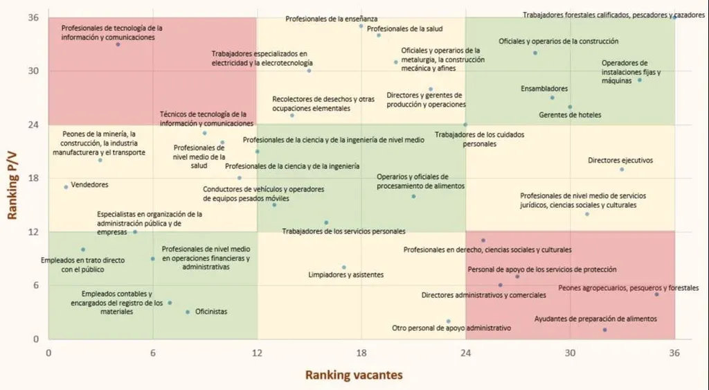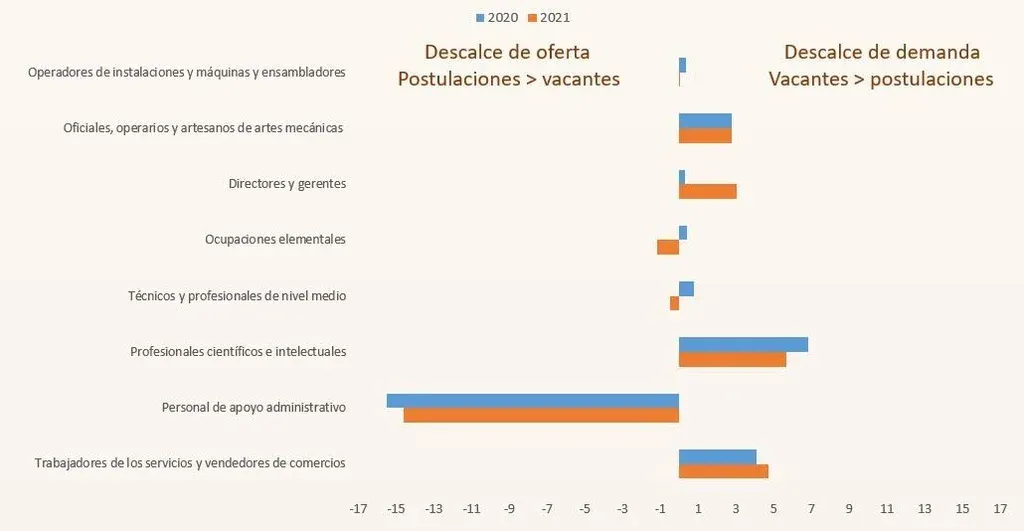 En ese sentido, los resultados del estudio sugieren que existe un exceso de oferta de habilidades en ocupaciones asociadas a personal de apoyo administrativo, mientras que el caso contrario se da en ocupaciones de profesionales, científicos e intelectuales y trabajadores de los servicios y comercios, en los que se observa un exceso de vacantes o demanda de habilidades.