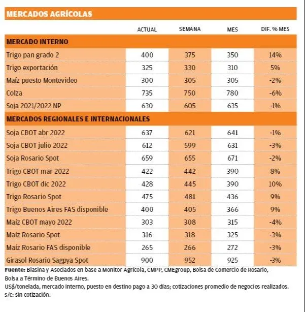 En el balance, las referencias del resto de los granos no tuvieron grandes variaciones: la colza sigue sobre US$ 740, el trigo sobre los US$ 330 y la cebada en US$ 365, siempre por tonelada.