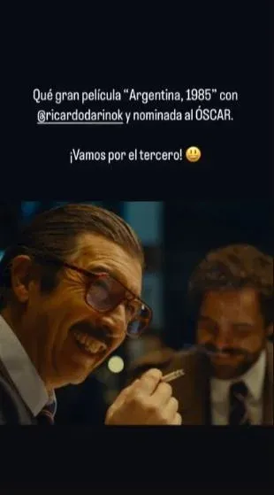 "Qué gran película '1985' con Ricardo Darín y nominada al Oscar. Vamos por el tercero", escribió Messi en su historia de Instagram sobre el film que narra el juicio a los jefes militares de la última dictadura de Argentina (1976-1983) por aberrantes delitos de lesa humanidad.