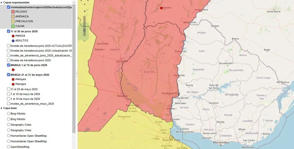 Explicó que la situación de vigilancia es coordinada con el Servicio Nacional de Sanidad y Calidad Agroalimentaria (Senasa) de Argentina y que, llegado el caso, no hay una recomendación única para el productor que pueda verse afectado, dado que eso depende de las características del eventual foco de ataque.
