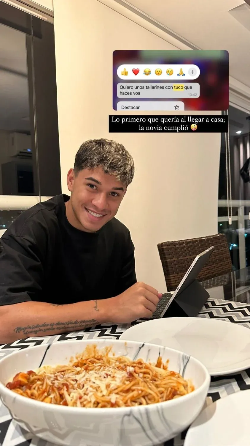Torres publicó una captura de pantalla documentando el pedido que le hizo su pareja: "Quiero unos tallarines con tuco que hacés vos", le solicitó. Y Torres, cumplió.