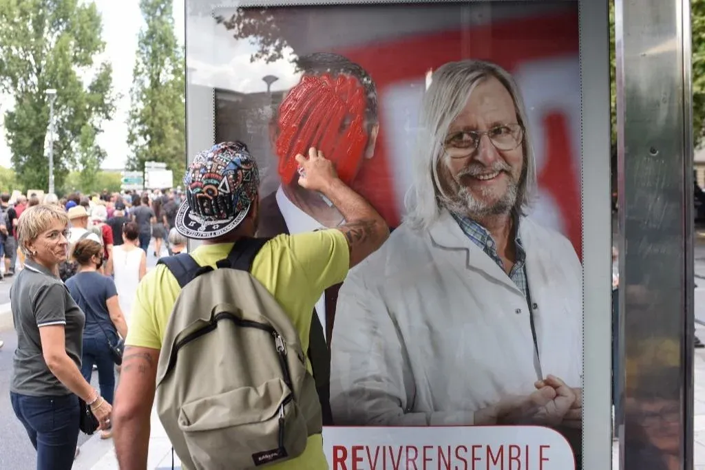 Un hombre rocía pintura sobre un cartel con retratos del ministro de salud francés Olivier Veran y el médico francés Didier Raoult al margen de una manifestación contra el pase de salud obligatorio Covid-19 para acceder a la mayor parte del espacio público, en Nantes, en el oeste de Francia.