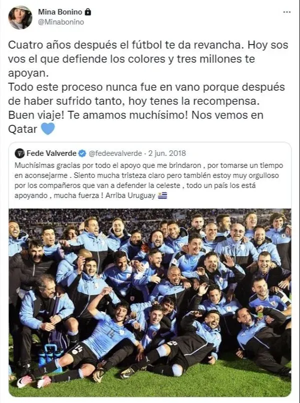 “Cuatro años después el fútbol te da revancha. Hoy sos vos el que defiende los colores y tres millones te apoyan”, le escribió al “Halcón”, quien hoy es figura en Real Madrid y el jugador de Uruguay que llega en mejor momento a Qatar.