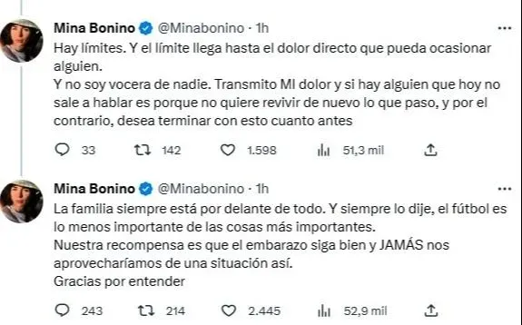 "Hay límites. Y el límite llega hasta el dolor directo que pueda ocasionar alguien. Y no soy vocera de nadie. Transmito MI dolor y si hay alguien que hoy no sale a hablar es porque no quiere revivir de nuevo lo que paso, y por el contrario, desea terminar con esto cuanto antes. La familia siempre está por delante de todo. Y siempre lo dije, el fútbol es lo menos importante de las cosas más importantes. Nuestra recompensa es que el embarazo siga bien y JAMÁS nos aprovecharíamos de una situación así. Gracias por entender", concluyó Bonino.