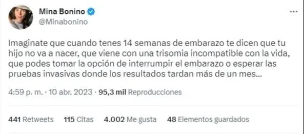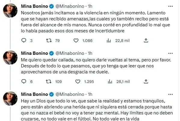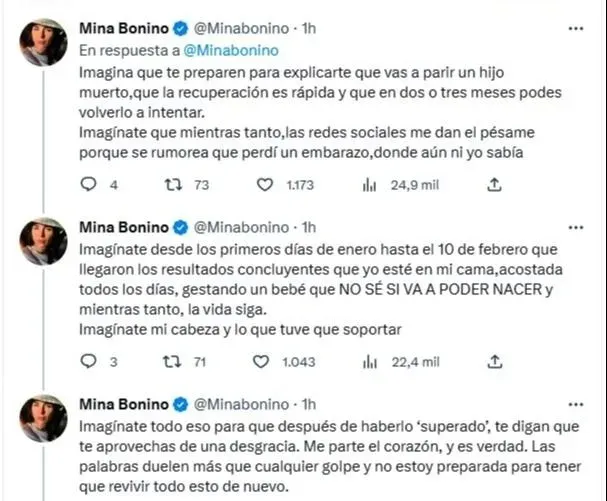 En su cuenta @minabonino, la pareja de Valverde publicó un hilo en el que expresó su sentir antes la situación vivida: "Imaginate que cuando tenes 14 semanas de embarazo te dicen que tu hijo no va a nacer, que viene con una trisomia incompatible con la vida, que podes tomar la opción de interrumpir el embarazo o esperar las pruebas invasivas donde los resultados tardan más de un mes. Imagina que te preparen para explicarte que vas a parir un hijo muerto, que la recuperación es rápida y que en dos o tres meses podes volverlo a intentar. Imagínate que mientras tanto, las redes sociales me dan el pésame porque se rumorea que perdí un embarazo, donde aún ni yo sabía. Imagínate desde los primeros días de enero hasta el 10 de febrero que llegaron los resultados concluyentes que yo esté en mi cama, acostada todos los días, gestando un bebé que NO SÉ SI VA A PODER NACER y mientras tanto, la vida siga. Imagínate mi cabeza y lo que tuve que soportar. Imagínate todo eso para que después de haberlo ‘superado’, te digan que te aprovechas de una desgracia. Me parte el corazón, y es verdad. Las palabras duelen más que cualquier golpe y no estoy preparada para tener que revivir todo esto de nuevo".