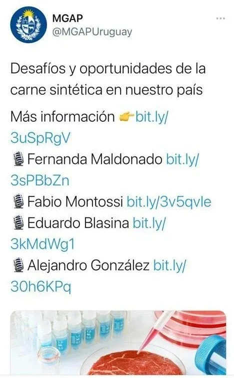 La cartera encabezada por Carlos María Uriarte había compartido, a través de su cuenta oficial, varios links sobre una conferencia organizada por CED Uruguay bajo el nombre "Desafíos y oportunidades de la carne sintética". La conferencia contó con la participación de Fernanda Maldonado, directora general del MGAP, así como el ingeniero Fabio Montossi –investigador del INIA–, el economista Alejandro González –director del Frigorífico Las Piedras–, y el ingeniero agrónomo Eduardo Blasina, y abordó desde el impacto de la ganadería en el medio ambiente hasta las perspectivas a futuro del mercado de carne vacuna.