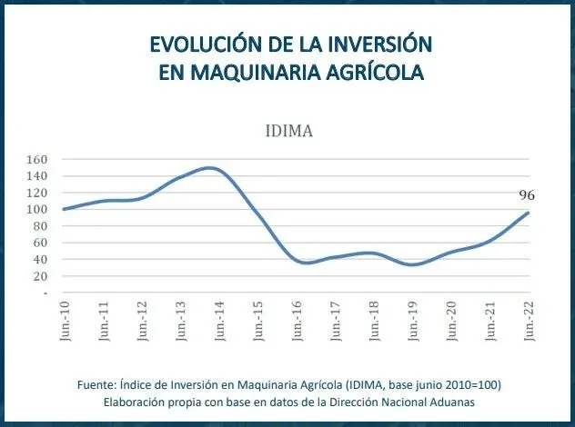 La compra de bienes de capital en Uruguay se realiza en un alto porcentaje a través de importaciones, ya sea de forma directa o indirecta. A partir de esta premisa, el Idima se utiliza como una proxy para evaluar la evolución de la inversión agrícola. Lo hace a través de la consideración de las importaciones en dólares constantes de tractores, sembradoras y cosechadoras de información proveniente de DNA. Para la zafra 2021/22 el valor del Idima se situó en 96 (base 1996 = 100).