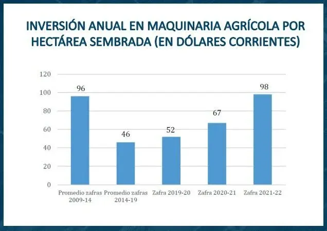 En las cifras de inversión de la última campaña incidieron dos aspectos comerciales: la demora en la importación y entrega de la maquinaria agrícola por dificultades en el aprovisionamiento y el aumento de precio de los equipos del orden de 20%.