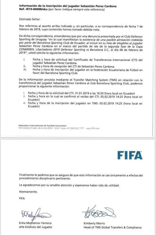 Frente a la situación que se planteó, Conmebol hizo un pedido de información a FIFA, que detalló lo siguiente sobre el caso de Sebastián Pérez.