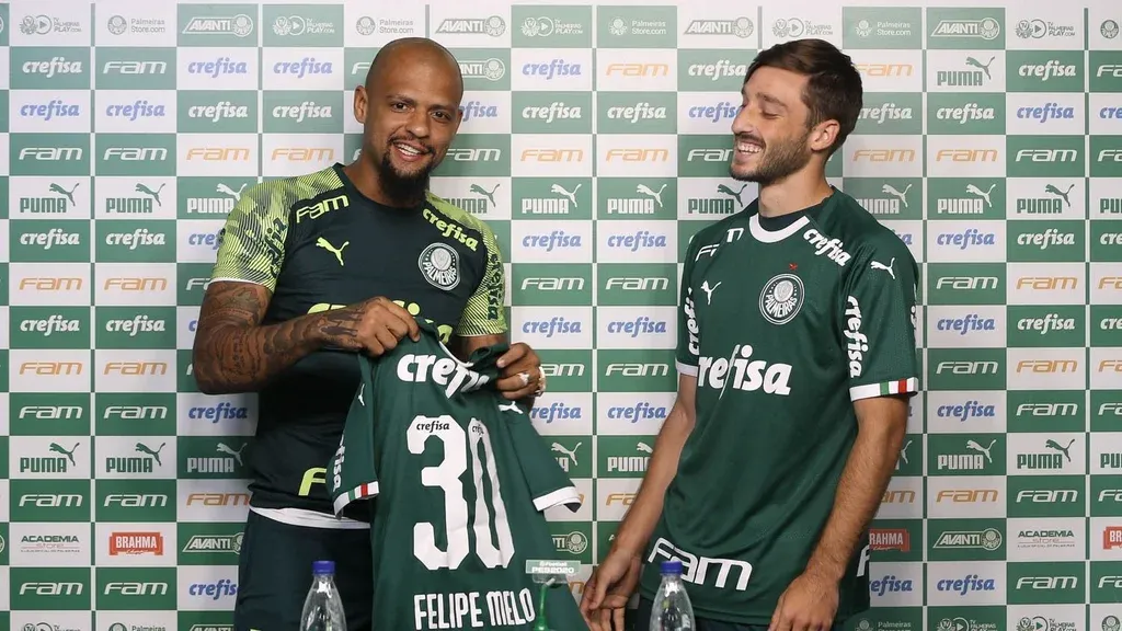 El exlateral de Nacional, Matías Viña, fue presentado este martes como nuevo jugador de Palmeiras de Brasil y el volante y capitán del equipo paulista, Felipe Melo, le dio la bienvenida al club en plena conferencia