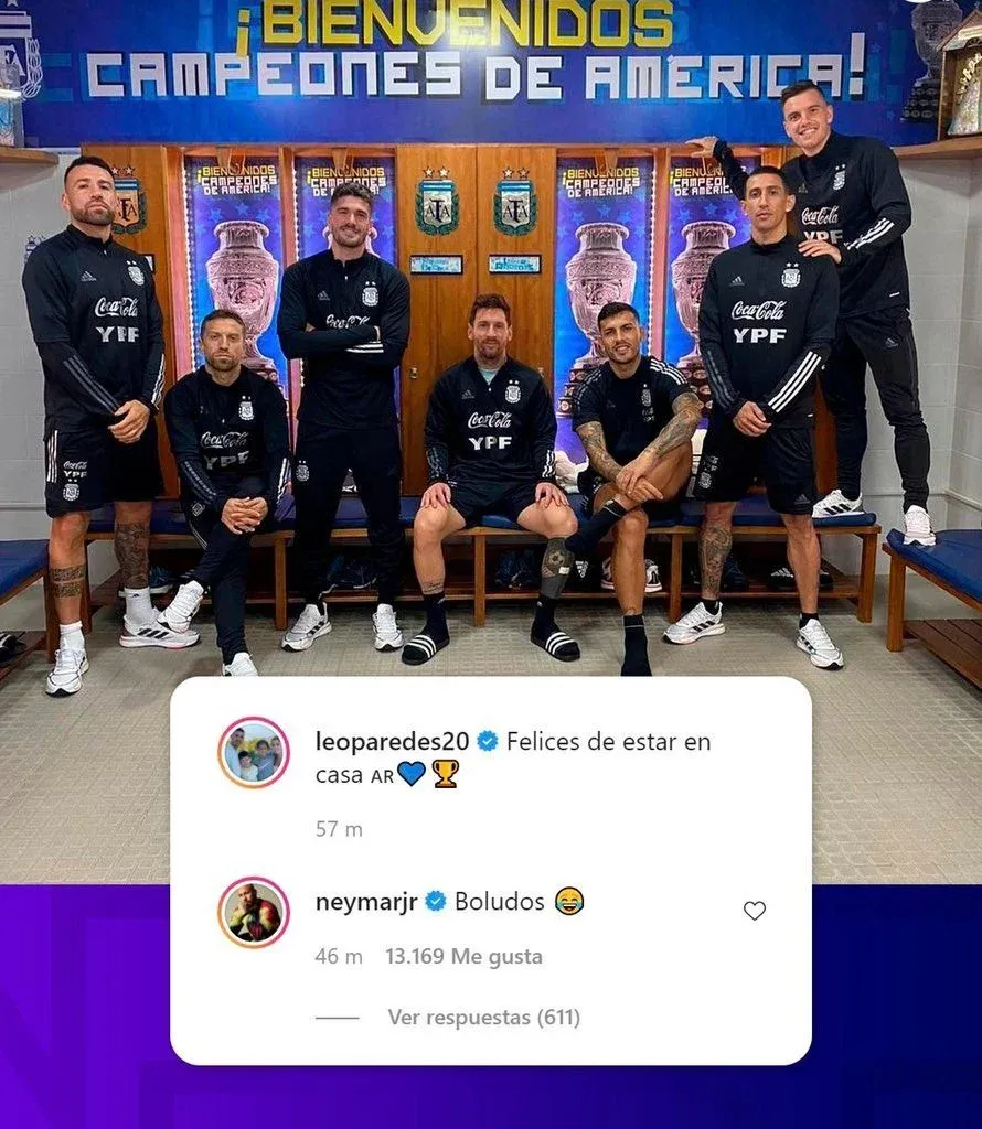 Paredes, que juega en el PSG, escribió: "Felices de estar en casa", a lo que Neymar, su compañero de equipo, respondió, "Boludos".
