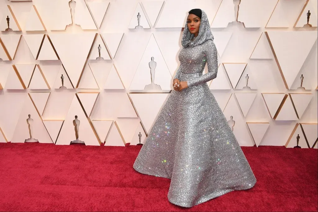 La cantante Janelle Monáe fue una de las que más llamó la atención, con un look algo futurista de dos piezas, brilloso, con aplicaciones de piedras plateadas y una capa sobre su cabeza.