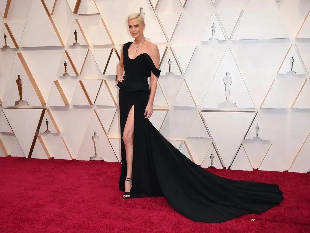 Charlize Theron eligió un vestido asimétrico negro de Dior, que es su firma de cabecera. La nominada a mejor actriz por El escándalo apostó por la tendencia de péplum en su vestido. Además, utilizó un collar de Tiffany con un diamante marquesa de más de 20 quilates.