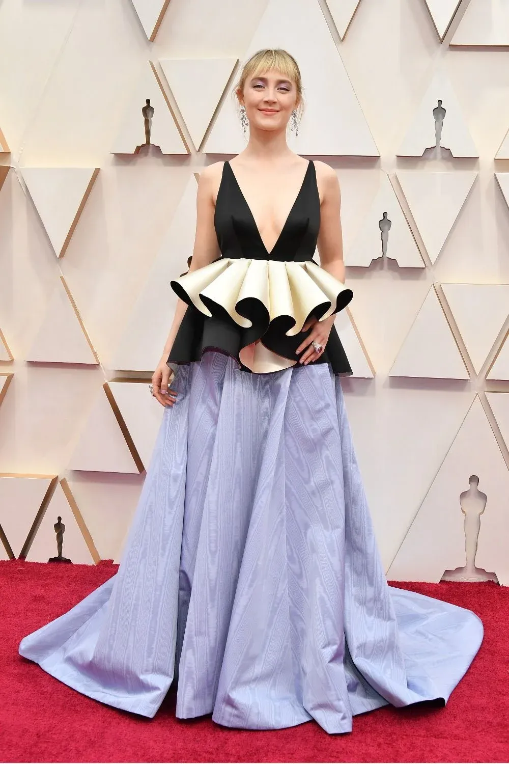 La irlandesa Saorise Ronan –nominada a mejor actriz por su interpretación de Jo en Mujercitas– fue de las más originales de la noche con un vestido de Gucci tricolor en negro, amarillo y lila, con péplum y escote en V.
