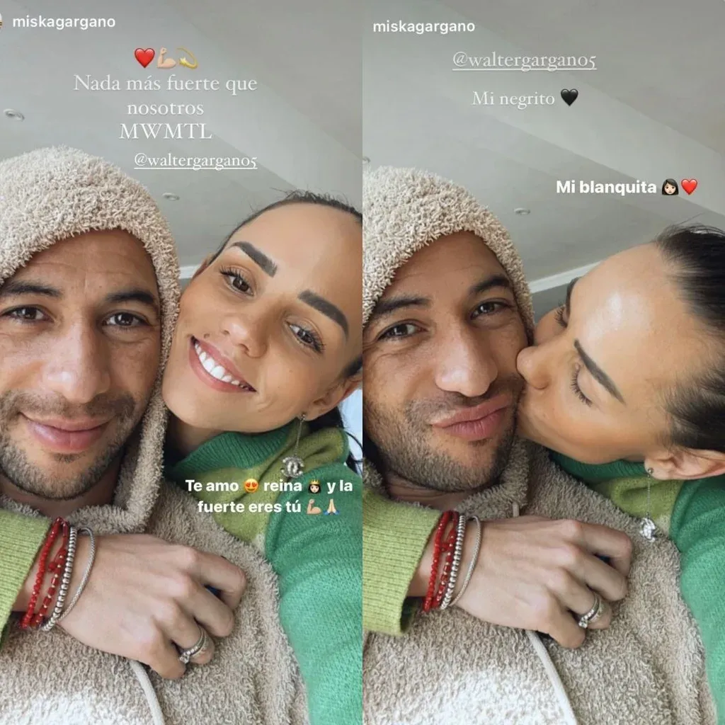 La modelo e influencer utilizó su cuenta de Instagram, donde acumula 134 mil seguidores, para pronunciarse acerca de la situación de su marido. "Nada más fuerte que nosotros", escribió sobre una fotografía de ambos que compartió en sus historias y agregó las iniciales MWMTL para referirse a su familia: Miska, Walter y sus tres hijos Matías, Thiago y Leo.