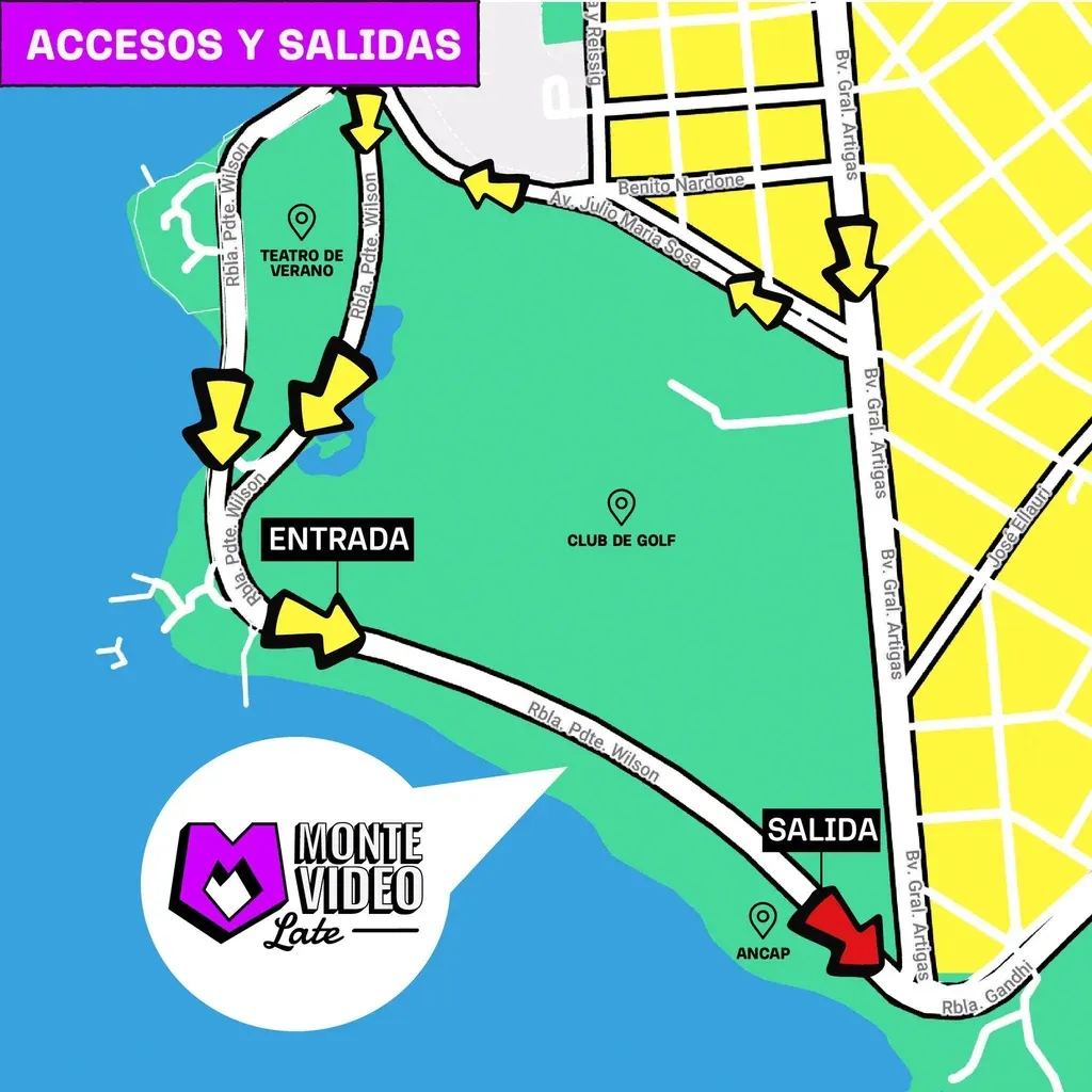 Mapa con los accesos y salidas en el Montevideo Late 2022