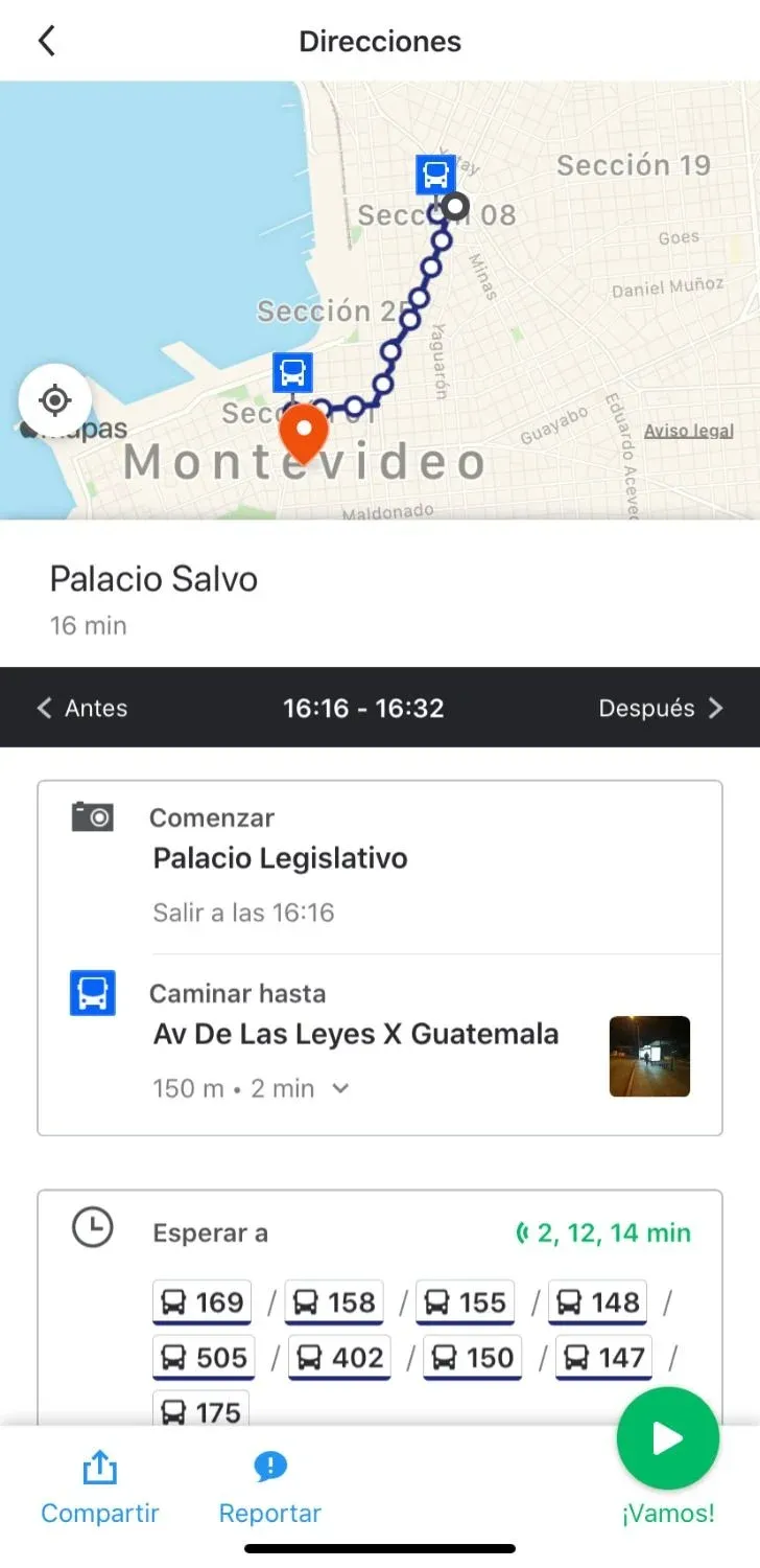 Otra ventaja es que, luego de escribir el origen y destino, sugiere un número de paradas para tomar ómnibus con el mapa ubicándolas. El usuario puede elegir alguna de ellas en función de la que le quede más cerca. Y, junto a Moovit, dice en tiempo real cuánto falta para que llegue un ómnibus a esa parada.