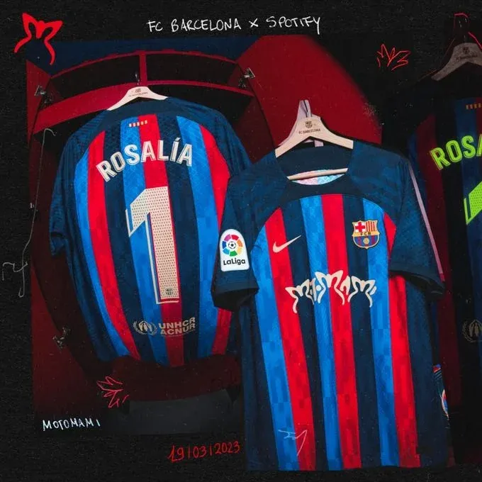 Instagram La camiseta que llevará FC Barcelona en el clásico "El logotipo de su último álbum, Motomami, se podrá ver de forma exclusiva en el pecho de los jugadores durante el Clásico que se disputará en el Spotify Camp Nou el domingo 19 de marzo", añadió el club barcelonista.