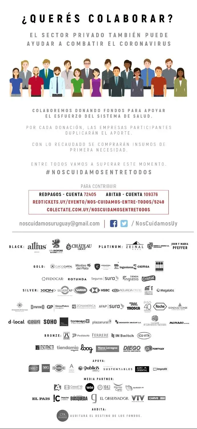 Actualmente se encargaron 35 mil kits, se mandaron a hacer en la industria nacional 25 mil prendas protectoras para el personal de la salud y se donarán 1.000 test de Ateez que fueron muy exitosos cuando se implementaron en Corea. Los canales disponibles para donar son: mediante Red Pagos con el número de cuenta 72405, en Abitab en la cuenta 109376, a través de colectate.com.uy/noscuidamosentretodos o por redtickets.uy.