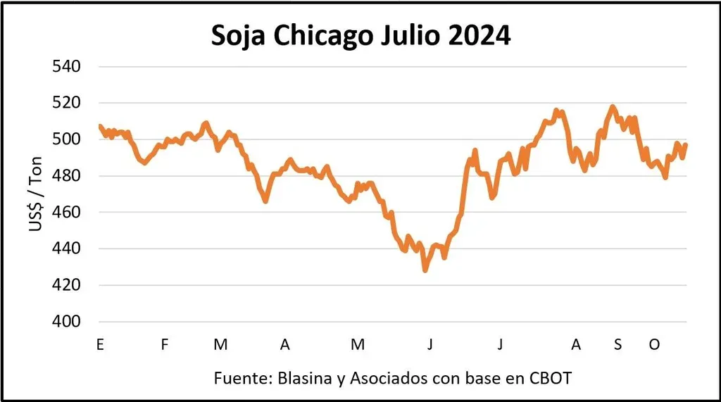 La soja recuperó cierto vigor en el mercado de Chicago en el cierre de la semana. Recompuso en las operaciones del viernes las pérdidas de la semana y cerró a US$ 476 por tonelada en la posición noviembre y US$ 497 por tonelada para la cosecha de 2024, un dólar por arriba del viernes pasado.