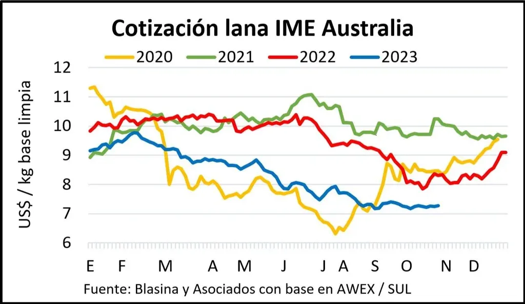 Desde principios de junio el índice está por debajo de los US$ 8, un período más largo en ese nivel que durante 2020, cuando la pandemia hizo caer notoriamente los precios. Hoy el IME está solamente 13% por debajo del valor de hace un año, con la aclaración de que en setiembre y octubre se registraron los precios más bajos de 2022 para la lana: en ese entonces el indicador venía de caer US$ 2 en pocas semanas, más de 20%.