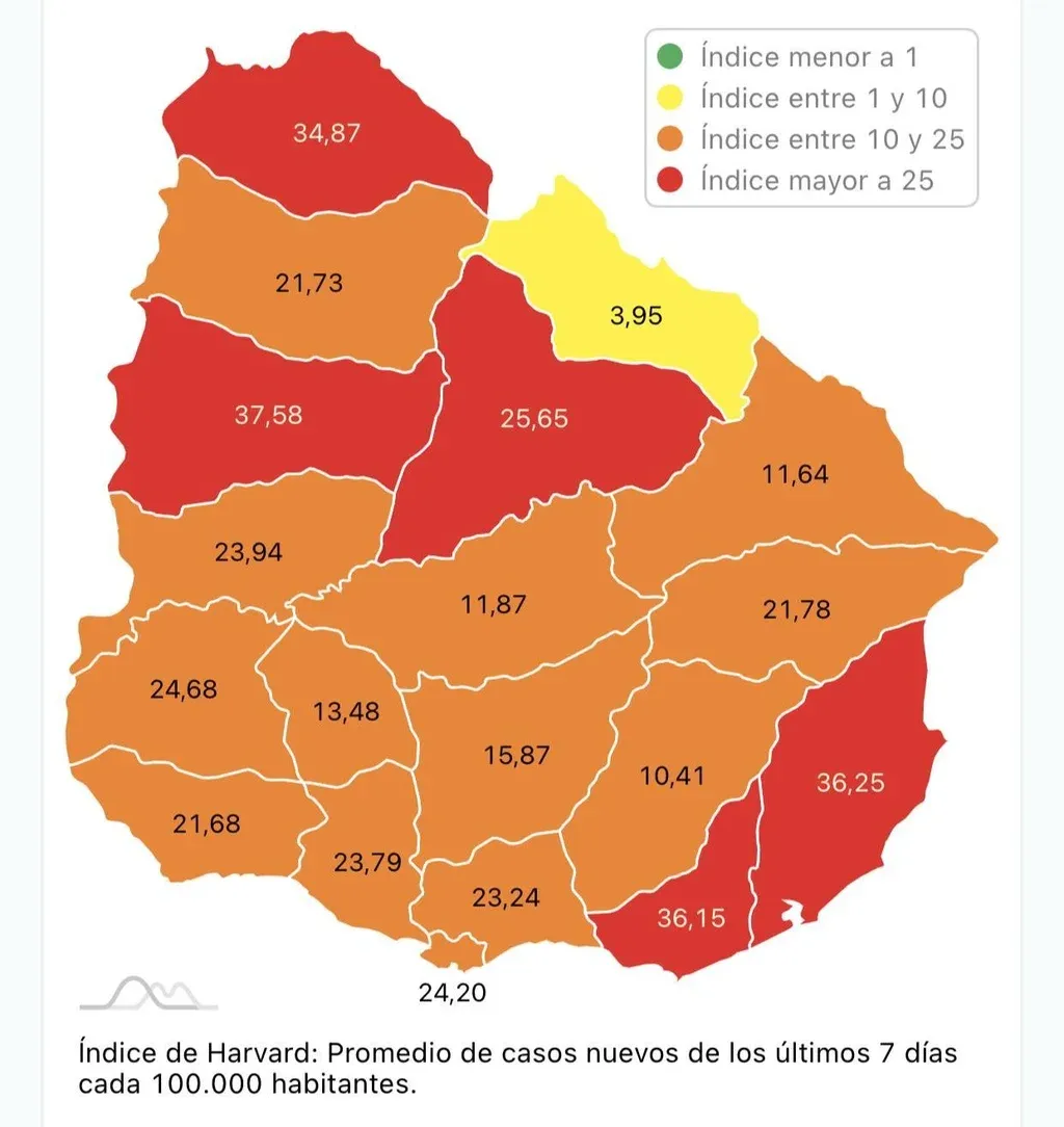 Con los datos de esta jornada, Uruguay salió de la zona de riesgo roja del Índice de Harvard, ya que registró menos de 25 casos de coronavirus promedio cada 100 mil habitantes en los últimos siete días. Este jueves ese promedio fue de 24,30 y de esa manera el país pasó a zona naranja según el índice que usa como referencia el gobierno.