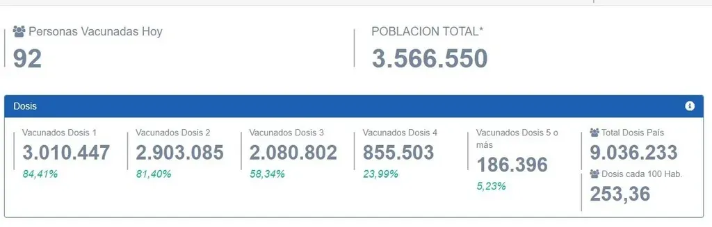 Según el monitor de datos de vacunación contra el coronavirus, en todo el país, más del 81,40% de la población se vacunó con dos dosis de la vacuna (que antes era obligatoria para ingresar a algunos lugares cuando regía la emergencia sanitaria), el 58,34% se dio la tercera dosis, mientras que vacunados con cuatro vacunas solamente es el 24%.
