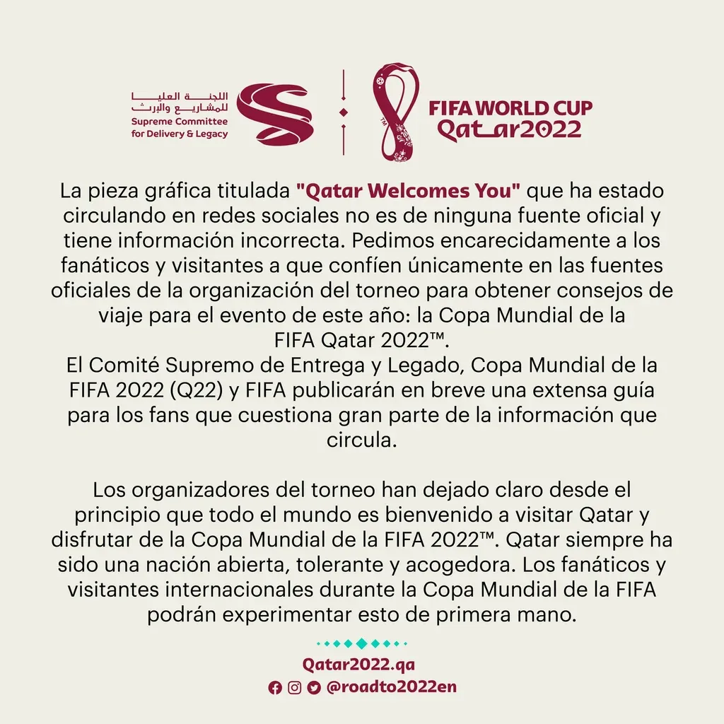 Desde la cuenta oficial del Comité de Organización y Legado de la Copa Mundial de la FIFA Qatar en Twitter, se hizo referencia a esa publicación, la que “no es de ninguna fuente oficial y tiene información incorrecta”, indicaron, sin profundizar en los puntos incorrectos.