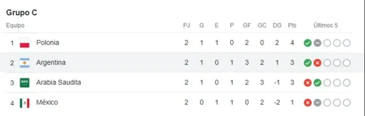 Hasta el momento el combinado argentino está segundo por detrás de Polonia, que tiene 4 unidades, y tiene los mismos puntos que Arabia, que este miércoles se enfrenta en simultáneo a México, último en la tabla del Grupo C con 1 punto.
