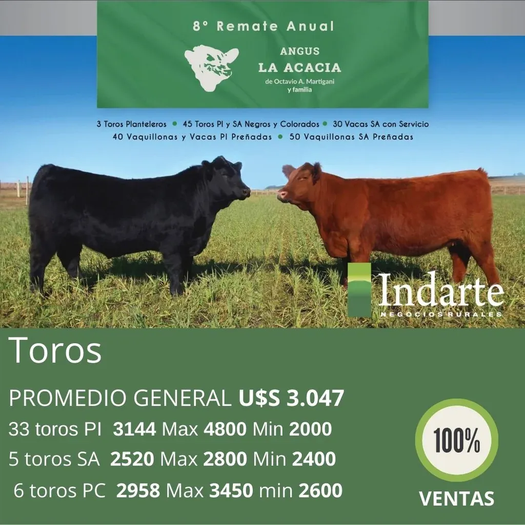 El equipo de Indarte & Cía remató –en la tarde del pasado martes 22–, 44 toros del 8° remate anual de La Acacia, de Octavio A. Martigani y Familia, a un valor promedio de US$ 3.047.
