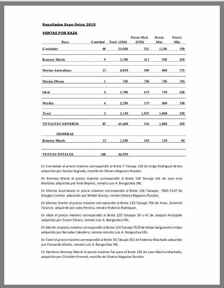 En Merino Donhe, se vendió un ejemplar por un valor total de US$ 750. El precio máximo (y promedio) correspondió al brete N° 130 (tatuaje 750) de Hnos. Scremini Taranco, adquirido por Julio Pereira. Remató Federico Rodríguez Negocios Rurales.