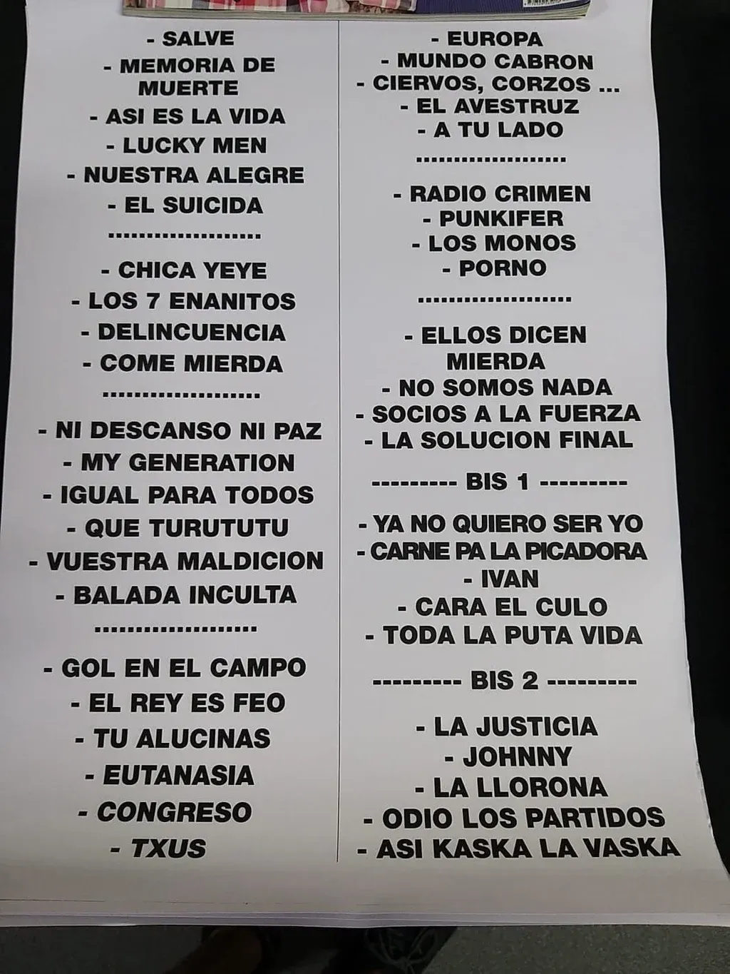 Llega Así es la vida, La chica Ye Ye, Delincuencia, Los 7 enanitos, Come mierda, Txus. La gente goza, baila, empuja, deja todo. Suena Iván, Toda la puta vida igual, suena Johnny.