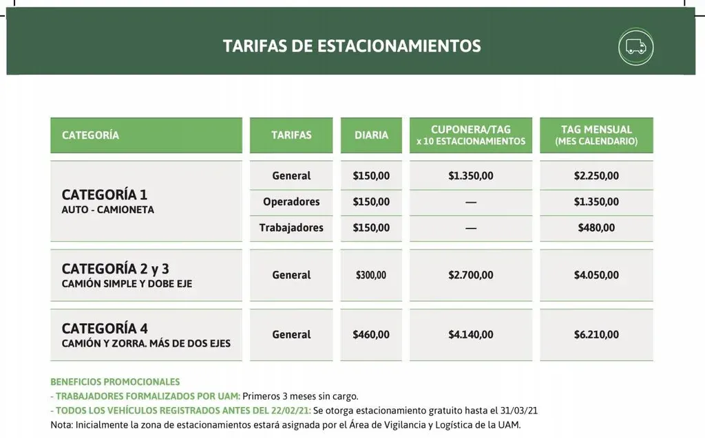 Quienes vayan en vehículos abonarán una tarifa hasta la hora 9; luego no se cobrará. La tarifa varía en función del tipo de vehículo y parte desde $ 150, con descuentos por compra de cuponeras o pagos mensuales. Los que ingresen a la zona de actividades logísticas o industriales (ZAC) no pagarán acceso.