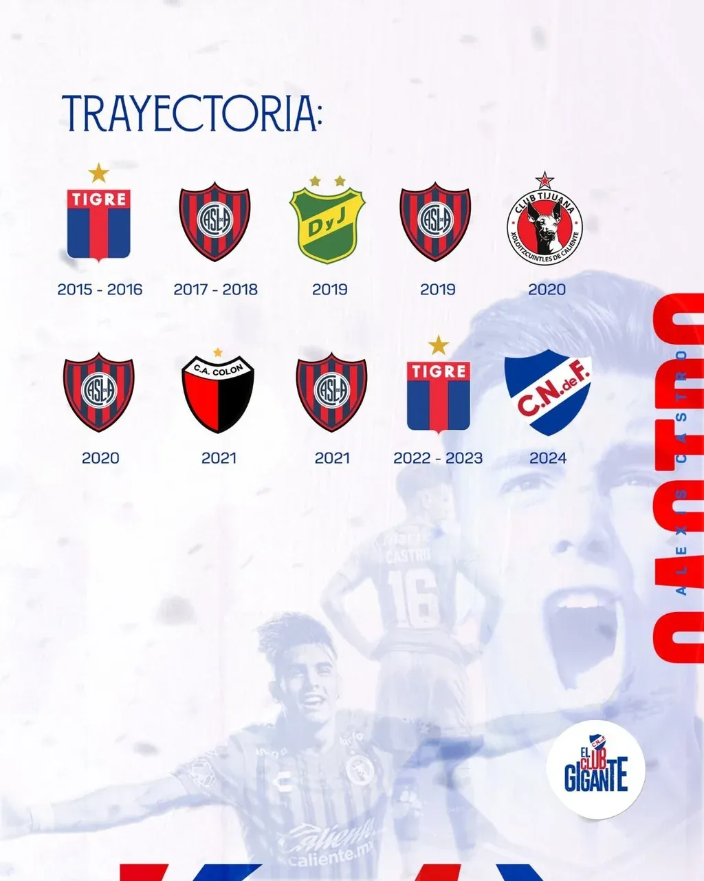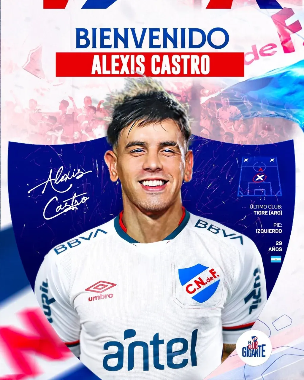 Nacional Alexis Castro en Nacional Castro, de pie zurdo y de 29 años, llega a los tricolores tras jugar en Tigre de su país. En ese club comenzó su carrera en la temporada 2015/16. Luego pasó por San Lorenzo de Almagro, Defensa y Justicia, nuevamente San Lorenzo, Tijuana de México, otra vez el CASLA, Colón de Santa, y San Lorenzo nuevamente, antes de Tigre y su pase a Nacional.