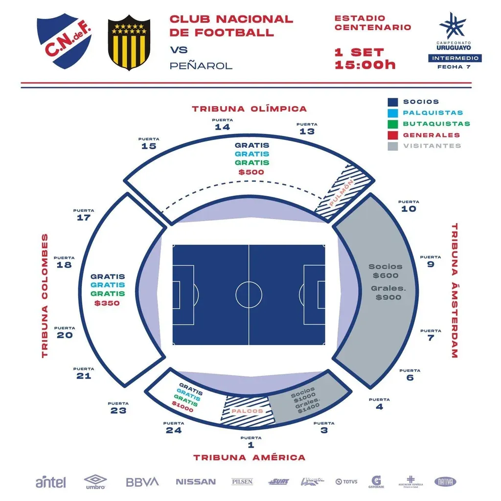 Por su parte, Peñarol irá a la Ámsterdam donde los socios pagarán $600 y las generales serán de $900, mientras que en el sector de la América los precios serán de $1.000 para socios y de $1.400 las generales.