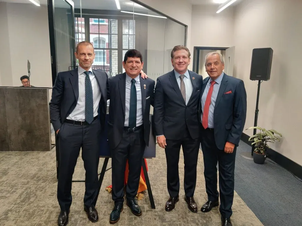 José Fuentes con lo presidentes de UEFA, Conmebol y la Federación Peruana