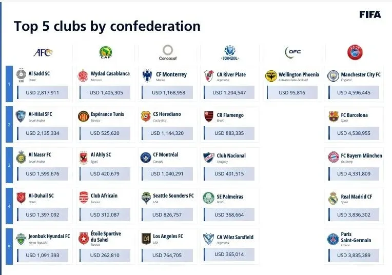 La FIFA publicó el reparto de los US$ 209 millones previstos en su Programa de Ayudas para los clubes que cedieron sus jugadores en el pasado Mundial de Qatar. El equipo que más dinero cobró es el Manchester City, mientras que entre los equipos de la Conmebol fue River Plate de Argentina.