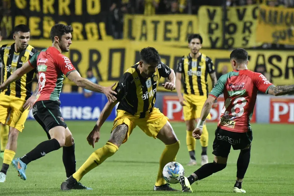 Rodrigo Pérez (izq) frente a Peñarol