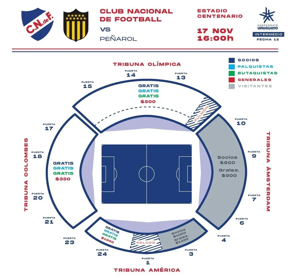 Tribuna Amsterdam (Peñarol), generales $900 y socios $600.