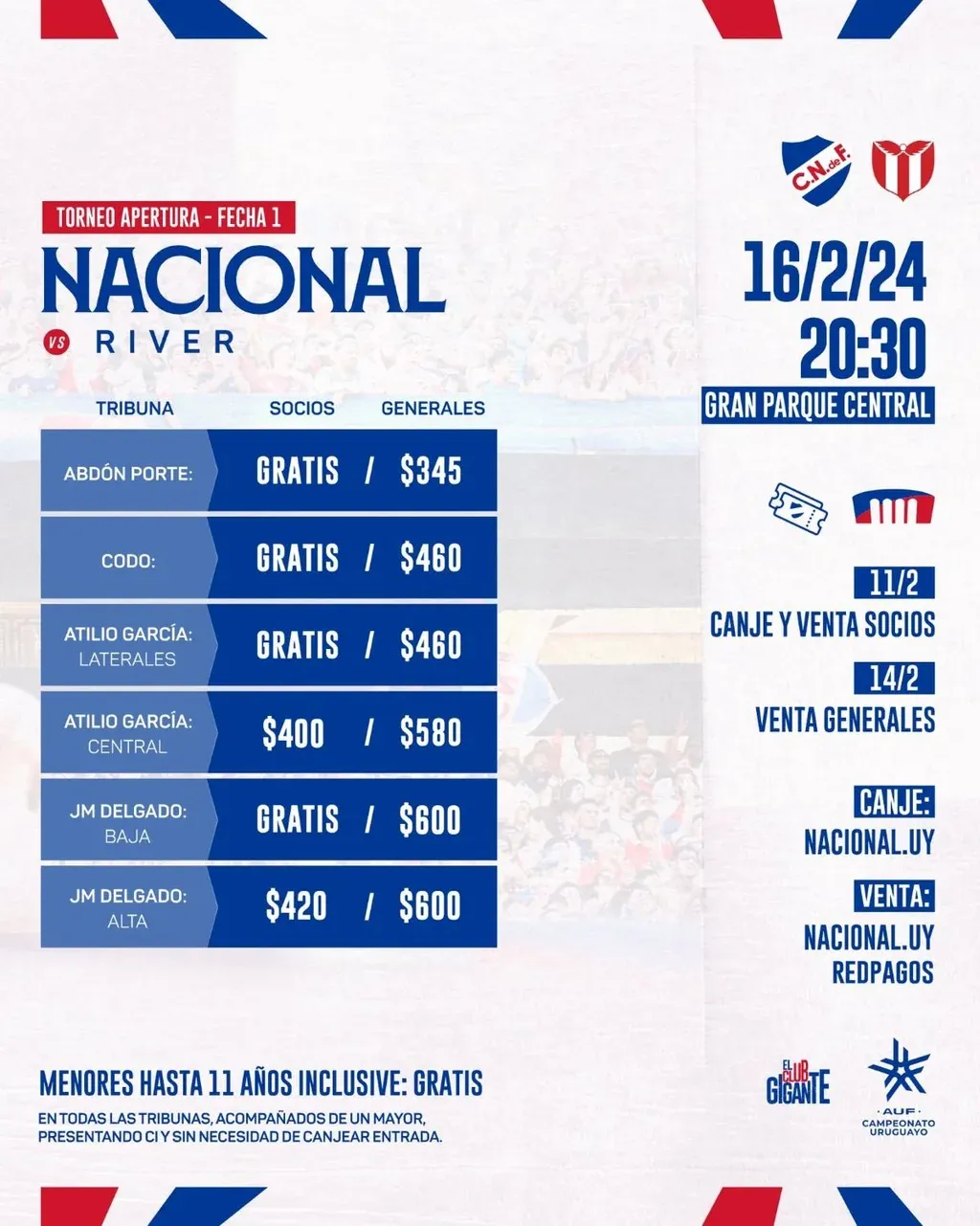 Los precios para hinchas y socios de Nacional son los siguientes: