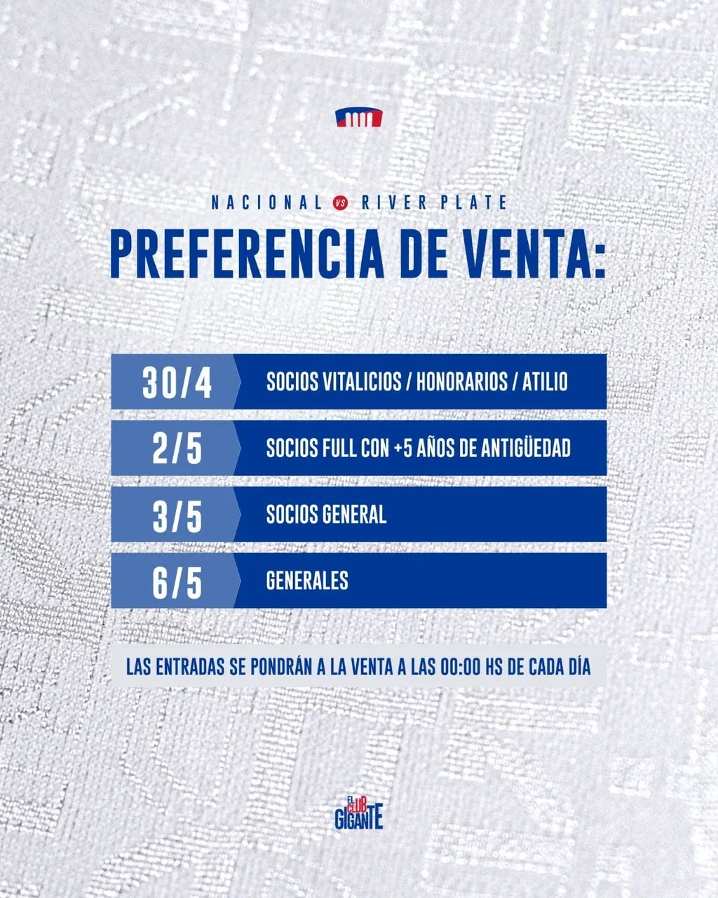 Nacional comenzó la venta de entradas para el partido ante River Plate argentino por Copa Libertadores 2024, encuentro que se jugará el próximo martes 7 de mayo a las 21:00 en el Gran Parque Central por la cuarta fecha de la fase de grupos.